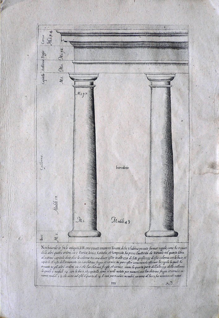 La stampa è tratta da “LI CINQVE ORDINI DI ARCHITETTVRA ET AGIVNTADE LOPERE DEL ECC.MO M. GIACOMO BAROCIO DA VIGNOLA” edito in Venezia presso la stamperia Remondini e appartiene ad un’edizione settecentesca dell’opera dell’architetto Giacomo Barozzi, detto il Vignola (1 ottobre 1507 – 7 luglio 1573). La stampa reca scritto: “Non hauendo io fra le antiquità di Roma trouato ornamento Toscano, di che n’habbia possuto formar regola, come ho trouato delli altri quatro ordeni, cio è Dorico, Ionico, Corintho, et Composito, ho preso l’auttorita da Vitruuio nel quarto libro al settimo capitolo, doue dice la colonna toscana douer eßer in altezza di sette großezze di eßa colonna con la base , et il capitelo. Il resto dell’ornamento cio è architraue fregio, et cornice, mi pare eßer conueneuole, oßeruar la regola la quale ho trouata ne gli altri ordeni cio è che l’architraue fregio, et cornice siano la quarta parte dell’altezza della collonna la quale è moduli 14. con la base, et capitello, come si uede notato per numeri cosi l’architraue fregio et cornice saranno moduli 3 i/2. che uiene ad eßer il quarto di 14. li suoi particulari membri saranno al luoco suo minutamente notati”.