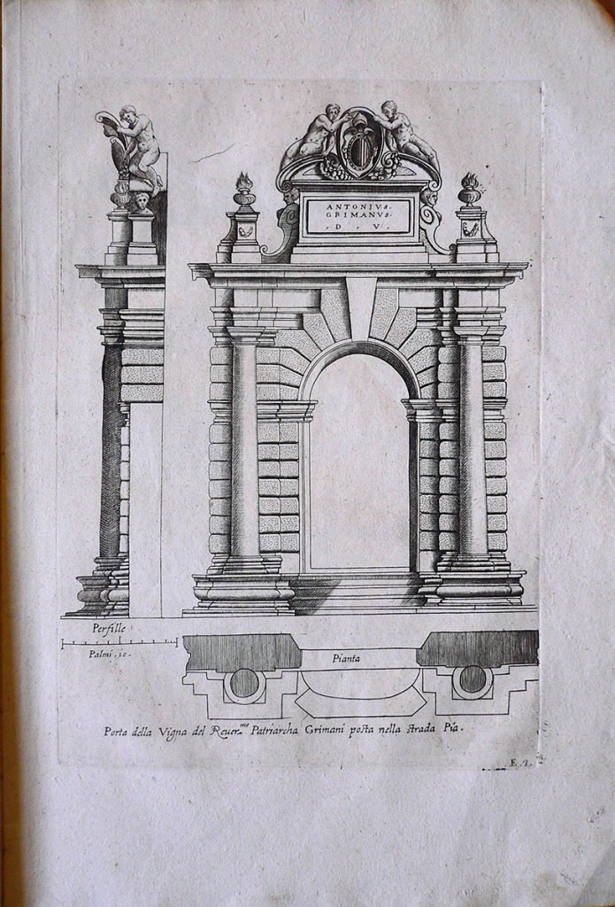 La stampa è tratta da “LI CINQVE ORDINI DI ARCHITETTVRA ET AGIVNTADE LOPERE DEL ECC.MO M. GIACOMO BAROCIO DA VIGNOLA” edito in Venezia presso la stamperia Remondini e appartiene ad un’edizione settecentesca dell’opera dell’architetto Giacomo Barozzi, detto il Vignola (1 ottobre 1507 – 7 luglio 1573). La stampa reca scritto: “Porta della Vigna del Reuer.mo Patriarcha Grimani posta nella strada Pia.”