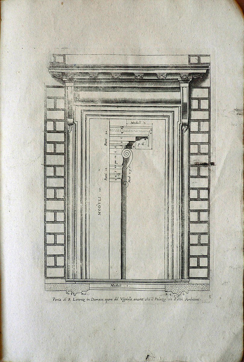 La stampa è tratta da “LI CINQVE ORDINI DI ARCHITETTVRA ET AGIVNTADE LOPERE DEL ECC.MO M. GIACOMO BAROCIO DA VIGNOLA” edito in Venezia presso la stamperia Remondini e appartiene ad un’edizione settecentesca dell’opera dell’architetto Giacomo Barozzi, detto il Vignola (1 ottobre 1507 – 7 luglio 1573). La stampa reca scritto: “Porta di S. Lorenzo in Damaso, opera del Vignola ancora che il Palazzo sia d’altri Architetti.”