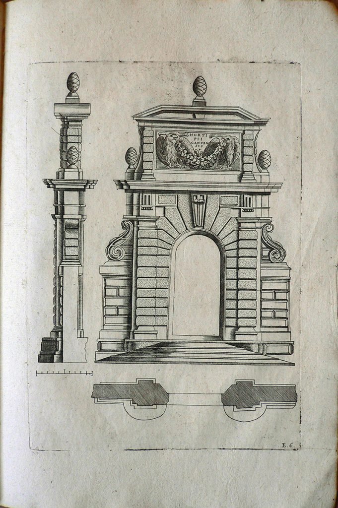 E’ rappresentato un portale, con proiezioni laterale e dall’alto. La stampa presenta una propria numerazione: E.6.. Il foglio fa parte di un libro rilegato.