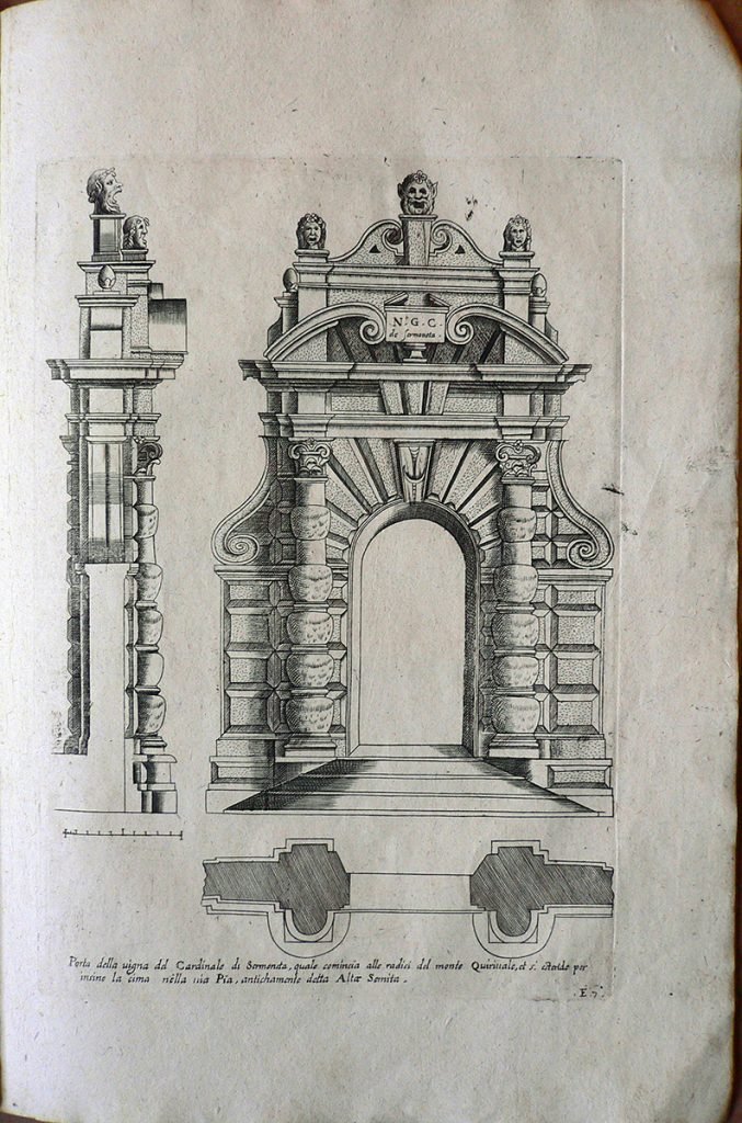 La stampa è tratta da “LI CINQVE ORDINI DI ARCHITETTVRA ET AGIVNTADE LOPERE DEL ECC.MO M. GIACOMO BAROCIO DA VIGNOLA” edito in Venezia presso la stamperia Remondini e appartiene ad un’edizione settecentesca dell’opera dell’architetto Giacomo Barozzi, detto il Vignola (1 ottobre 1507 – 7 luglio 1573). La stampa reca scritto: “Porta della uigna del Cardinale di Sermoneta, quale comincia alle radici del monte Quirinale, et s’estende per insino la cima nella uia Pia, antichamente detta Alta Semita..”
