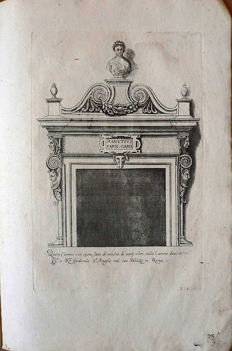 La stampa è tratta da “LI CINQVE ORDINI DI ARCHITETTVRA ET AGIVNTADE LOPERE DEL ECC.MO M. GIACOMO BAROCIO DA VIGNOLA” edito in Venezia presso la stamperia Remondini e appartiene ad un’edizione settecentesca dell’opera dell’architetto Giacomo Barozzi, detto il Vignola (1 ottobre 1507 – 7 luglio 1573). La stampa reca scritto: “Questo Camino e in opera, fatto di mischio di uarii colori, nella Camera doue dorme Ill.mo et R.mo Cardinale S.to Angelo nel suo Palazzo in Roma.”