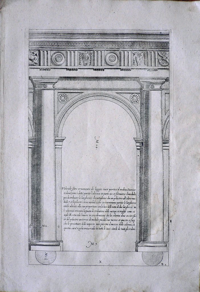 La stampa è tratta da “LI CINQVE ORDINI DI ARCHITETTVRA ET AGIVNTADE LOPERE DEL ECC.MO M. GIACOMO BAROCIO DA VIGNOLA” edito in Venezia presso la stamperia Remondini e appartiene ad un’edizione settecentesca dell’opera dell’architetto Giacomo Barozzi, detto il Vignola (1 ottobre 1507 – 7 luglio 1573). La stampa reca scritto: “Volendo fare ornamento de loggie ouer portici d’ordine Dorico si deue (come è detto) partir l’altezza in parti 10. et formarne il modulo; poi distribuire le larghezze che uenghino da un pilastro all’altro moduli 7. et li pilastri sieno moduli 3. che cosi veniranno partite le larghezze con le altezze alla sua proportione con la luce delli vani di due larghezze in l’altezza et venira la giusta destributione delle metope et triglife come si vede. Resta solo hauere in consideratione che la colonna deue uscire fuor del pilastro un terzo di modulo piu del suo mezzo et questo si fa per che le proietture delle imposte non passino in mezzo delle colonne, et questa sarà regola uniuersale in tutti li casi simili de tutti gli ordini”.
