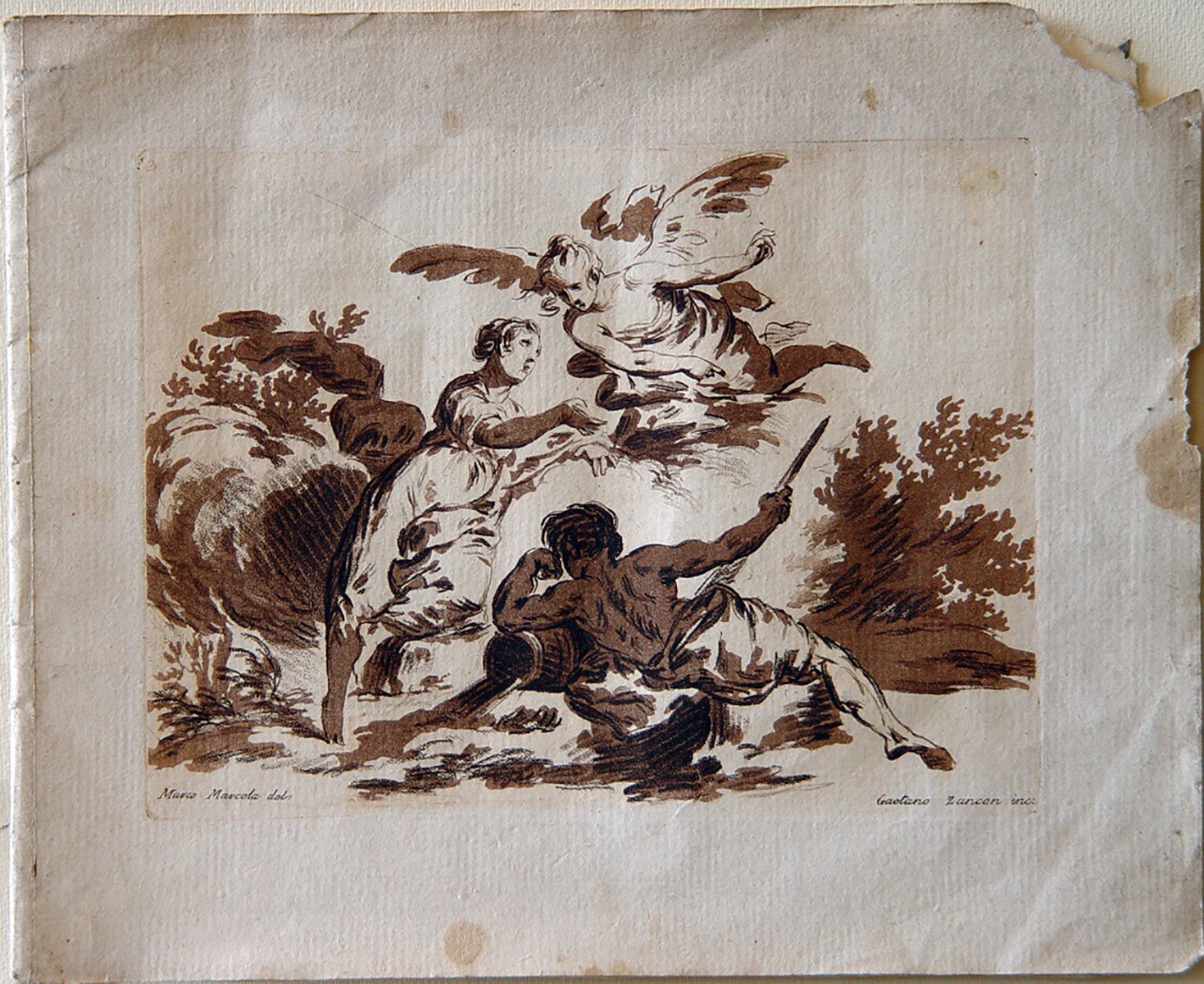 E’ ritratta una donna appoggiata col fianco ad un masso parla ad una donna alata che le vola accanto. Un uomo ai suoi piedi è disteso a terra e poggia con il gomito su un’anfora da cui esce dell’acqua. Presenza di numero in alto a sinistra: N.3. Firma in basso a destra per l’incisore e a sinistra per il disegnatore. Presenza di filigrana: mezzaluna nel lato in alto a sinistra.