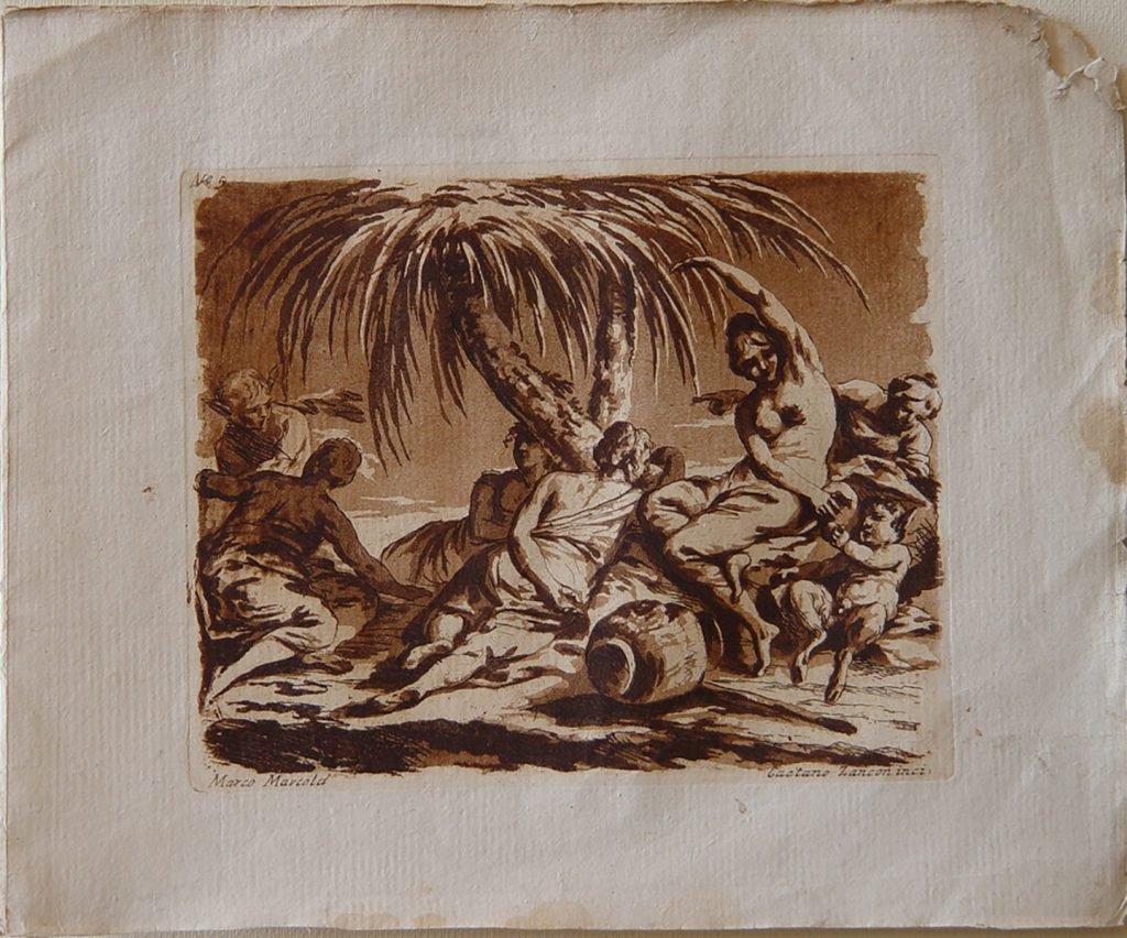 Sono ritratte donne e satiri riposano all’ombra di una palma. Presenza di numero in alto a sinistra: N.5. Firma in basso a destra per l’incisore e a sinistra per il disegnatore. Presenza di filigrana: V in alto a sinistra.