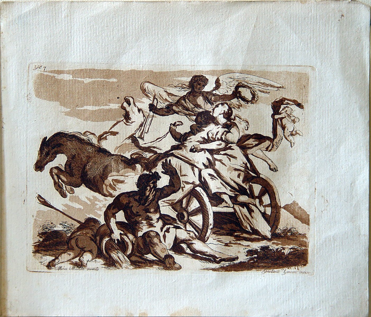 Sono ritratte due donne abbracciate sedute su un carro mentre spronano i cavalli. Personaggio alato sta accanto a loro e tiene in una mano una tromba, nell’altra una corona d’alloro. In terra un bimbo giace morto e un personaggio siede a terra appoggiato ad un’anfora.. Presenza di numero in alto a sinistra: N.7. Firma in basso a destra per l’incisore e a sinistra per il disegnatore. Presenza di filigrana: due mezzelune in alto a sinistra.