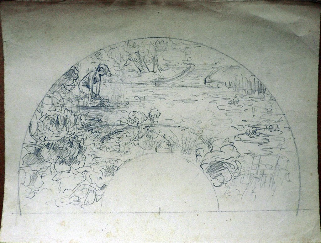Raffigurazione di un corso d’acqua con ninfee e rose sulle cui sponde c’è una giovane donna inginocchiata; sullo sfondo si vede una scalinata che scende al fiume. Da eseguirsi, presumibilmente sulla tela di un ventaglio.