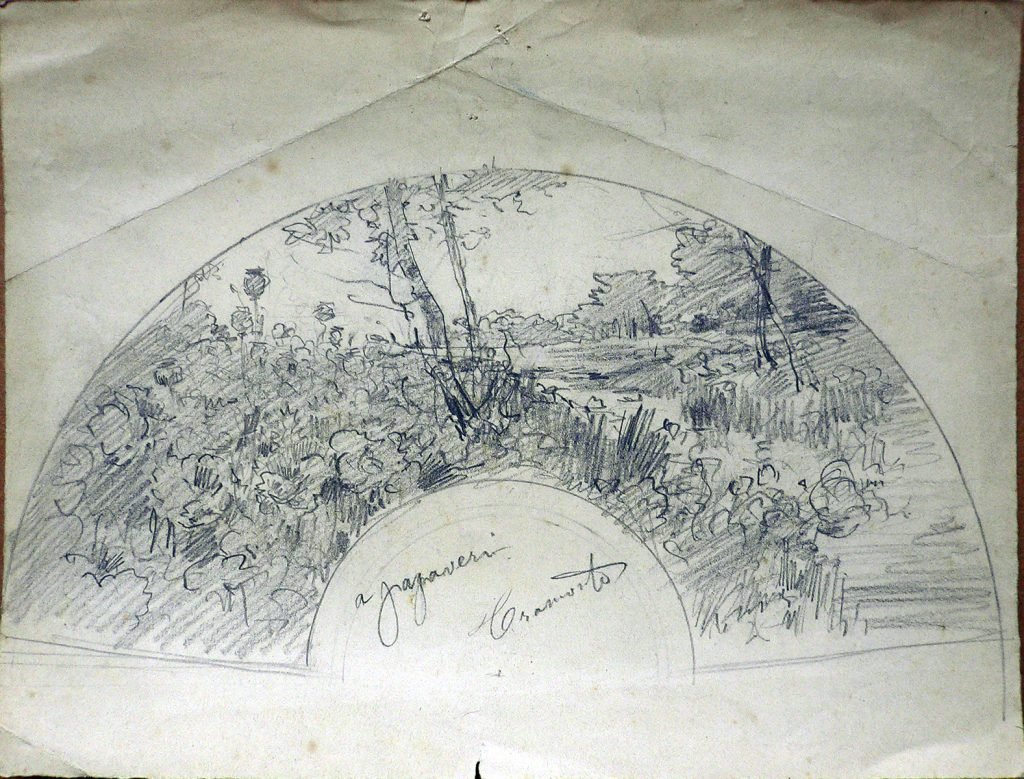 Raffigurazione di un paesaggio con campo di papaveri in primo piano e un bosco sullo sfondo da eseguirsi, presumibilmente sulla tela di un ventaglio. Al centro, in matita: a papaveri tramonto. Sul retro schizzo in matita di ventaglio con figure.