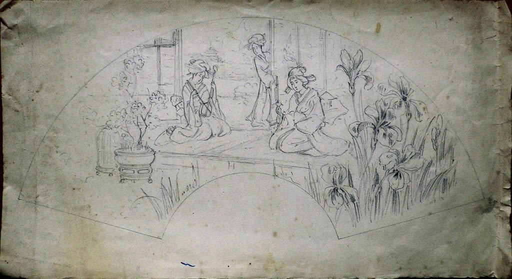 Raffigurazione di una scena: due donne giapponesi siedono su un tatami e suonano degli strumenti mentre una terza le osserva sulla soglia della casa; in primo piano iris; da eseguirsi, presumibilmente sulla tela di un ventaglio.