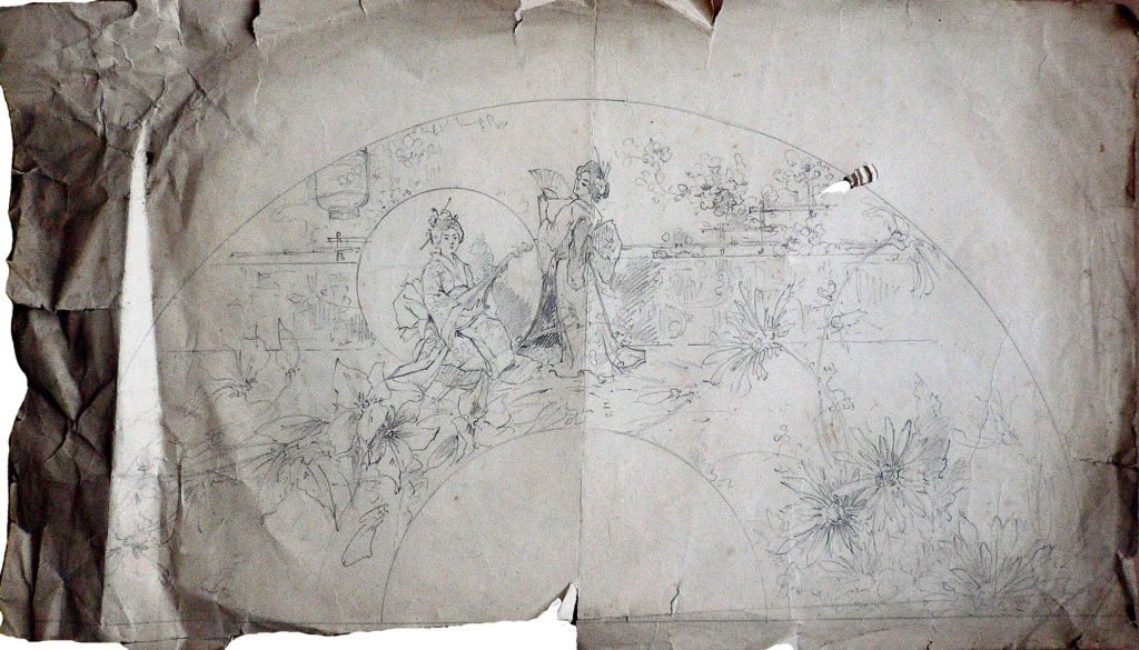 Raffigurazione di una scena: una donna giapponese suona seduta mentre una seconda è stante e con un ventaglio in mano; in primo piano anemoni e fiori di ciliegio. Da eseguirsi, presumibilmente sulla tela di un ventaglio.