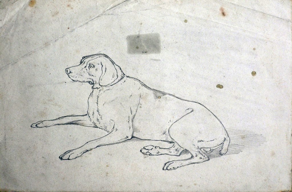 Bozzetto eseguito dal pittore bresciano Faustino Joli, riconducibile all’olio su tela “Un cane accosciato” conservato presso i Musei Civici d’Arte e Storia di Brescia (inv. 813).