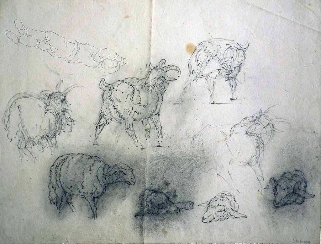 Sono raffigurate alcune capre e pecore in varie posizioni e tre particolari di musi di pecore.