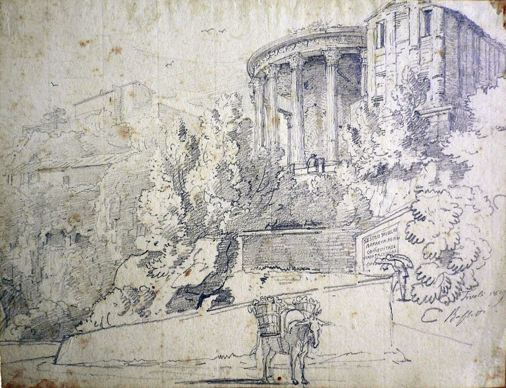 L’opera è uno dei bozzetti preparatori realizzati dal pittore bresciano, come modello preliminare alla tela dipinta. Il disegno ritrae uno dei luoghi più rappresentati dai paesaggisti di età neoclassica: il tempio ritenuto di Vesta, comunemente detto della Sibilla, sopra le cascate di Tivoli.