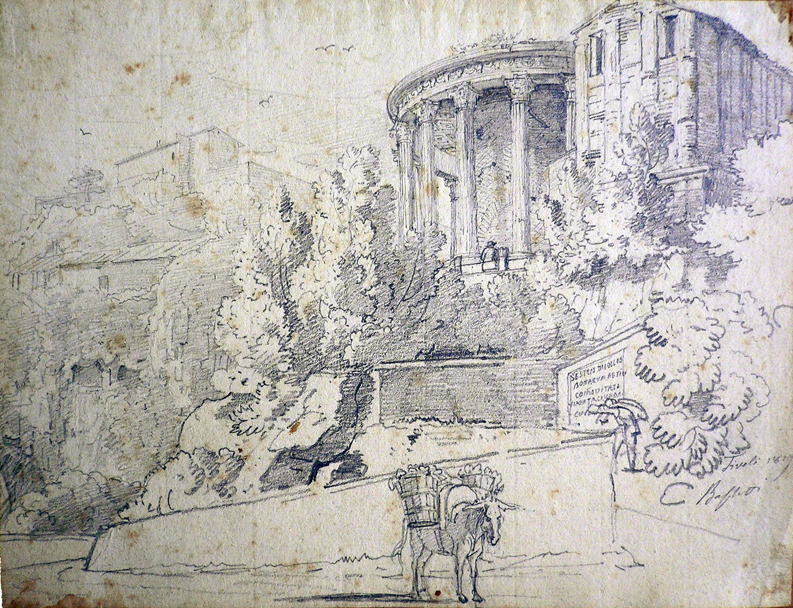 Il disegno raffigura lo scorcio, dal basso, del Tempio della Fortuna a Tivoli: un mulo carico sosta lungo la via che conduce al’edificio. Un uomo sta salendo al monumento con un sacco sulle spalle, mentre una coppia sta ammirando l’alto colonato ionico del portico circolare.