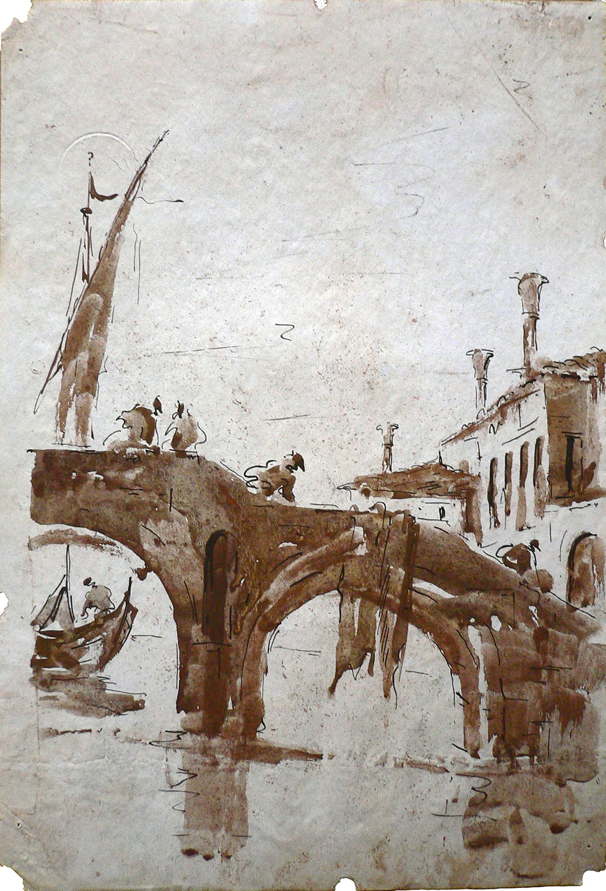 Alcune persone sostano su un ponte da cui pende un telo. Una barca passa sotto l’arcata, a sinistra. In alto a sinistra timbro.