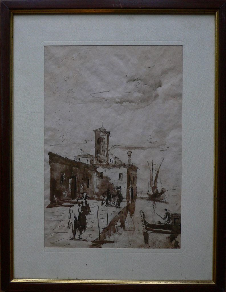 Alcune persone camminano lungo una banchina lastricata che è delimitata a sinistra dalle case e a destra dal canale. Una gondola si sta avvicinando alla sponda. La via è chiusa da un edificio dietro il quale si vede un campanile. Sul retro timbro Piero Malossi; in alto a sinistra timbro. Il disegno è incorniciato.