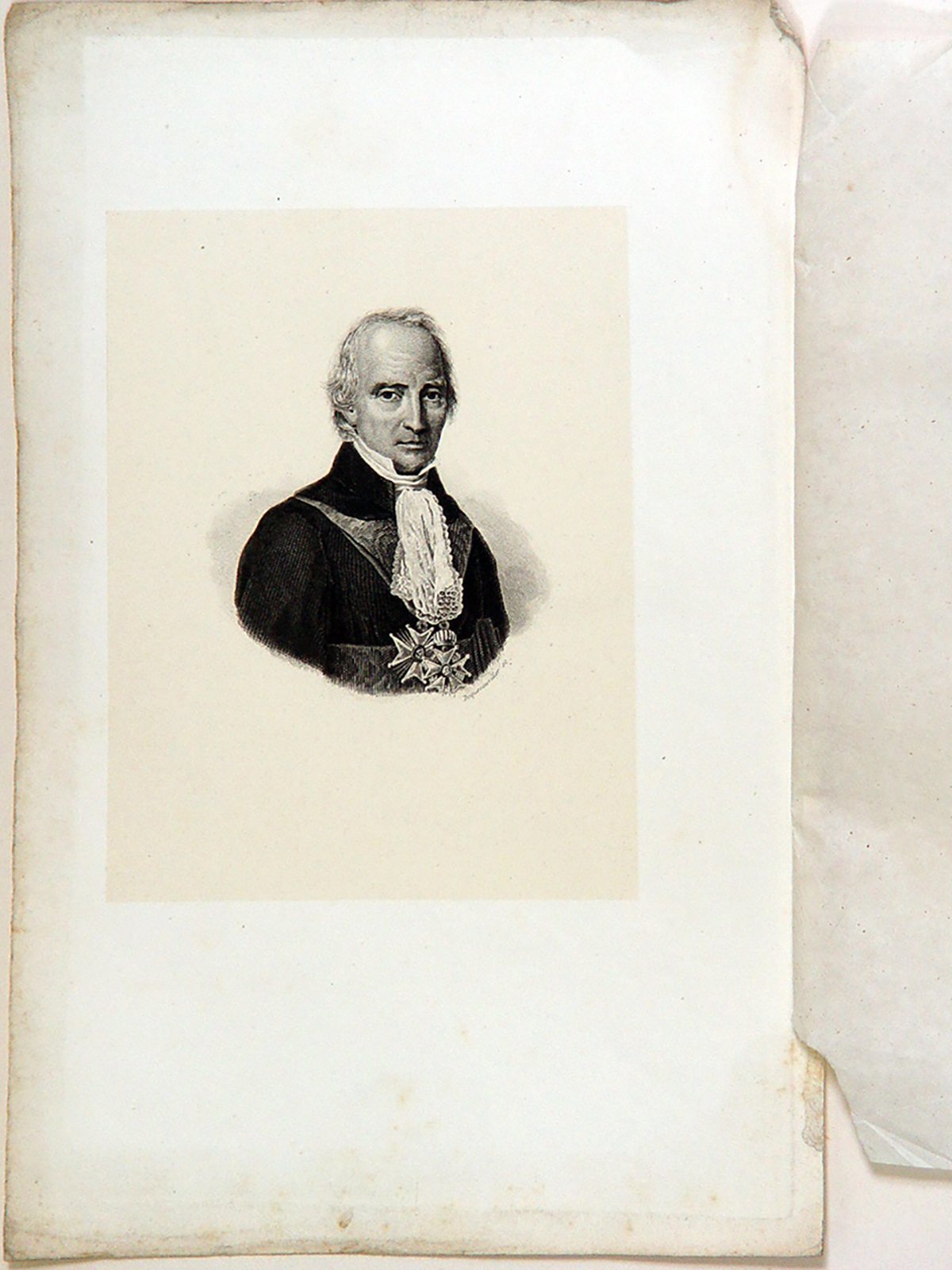 Mezzo busto di tre quarti profilo destro. Firma incisore in basso a destra. Presenza di carta velina su cui è scritto il titolo; la stampa è su carta colorata (beige) successivamente impressa su foglio di carta