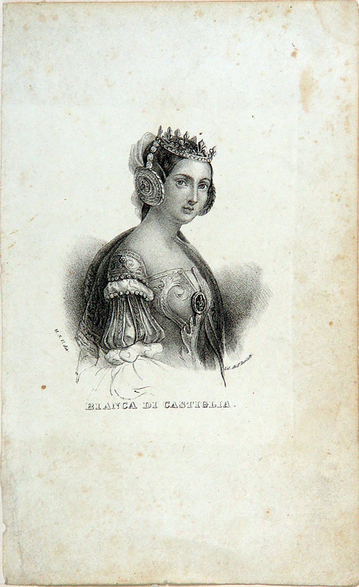 Mezzo busto di tre quarti lato destro. Firma disegnatore in basso a sinistra, litografo in basso a destra.