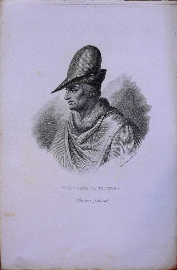 Ritratto mezza figura profilo sinistra del personaggio da titolo. Indossa una feluca e mantello con collo e bordura di pelliccia Firma in basso a destra.