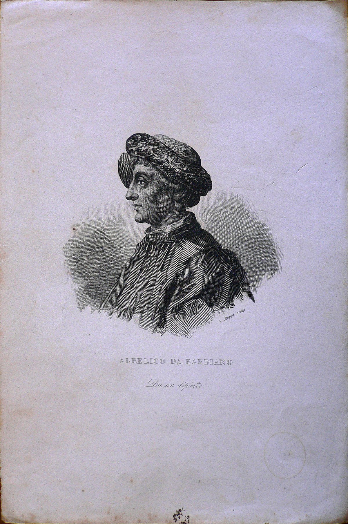 Ritratto mezzo busto profilo sinistro di personaggio da titolo. Gli occhi sono sporgenti e il naso pronunciato. Indossa ricco cappello di stoffa damascata. Firma in basso a destra.
