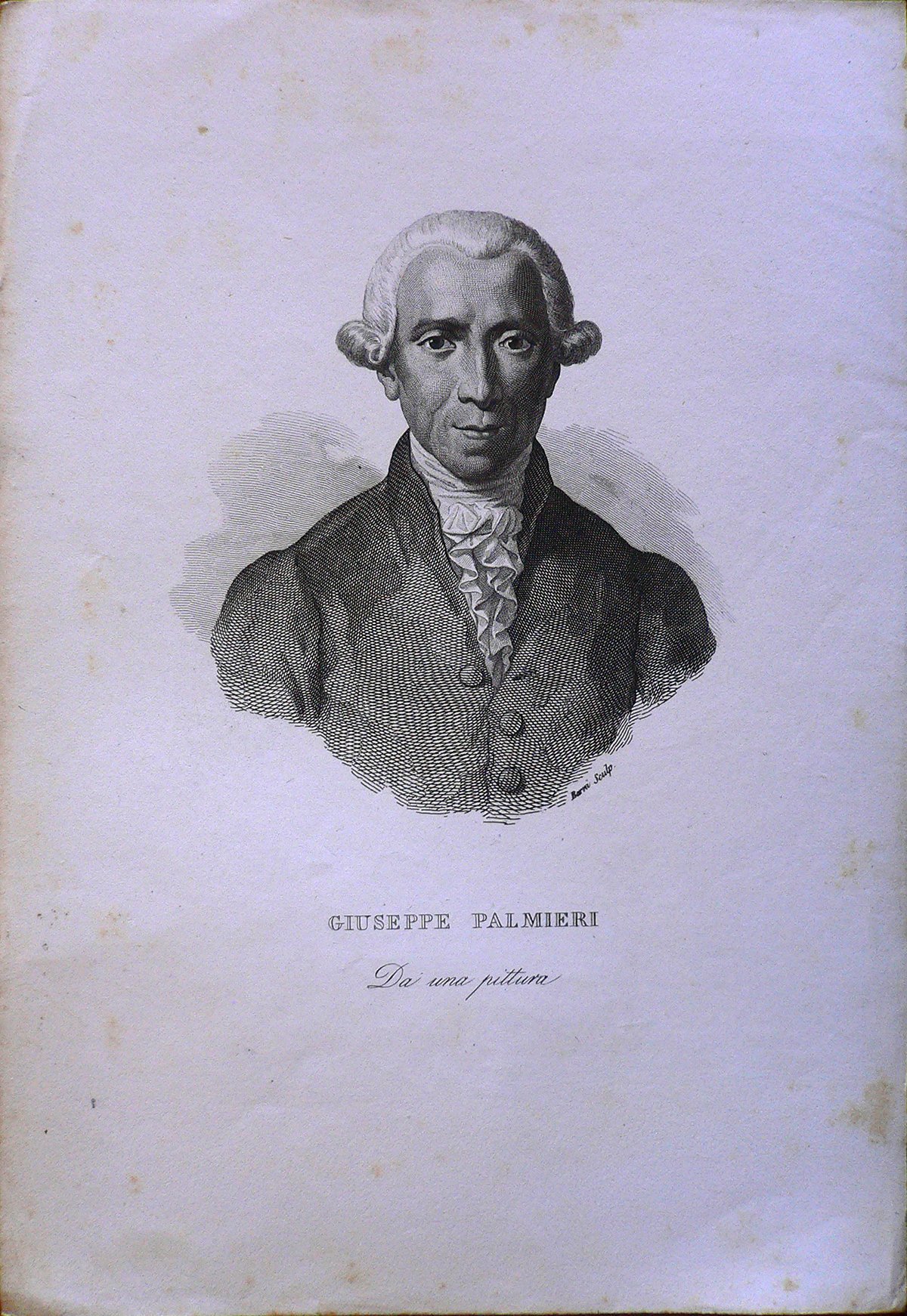 Ritratto mezzo busto frontale del protagonista. Il viso è segnato da rughe e incorniciato da una parrucca. Dal bavero spunta foulard bianco Firma in basso a destra.