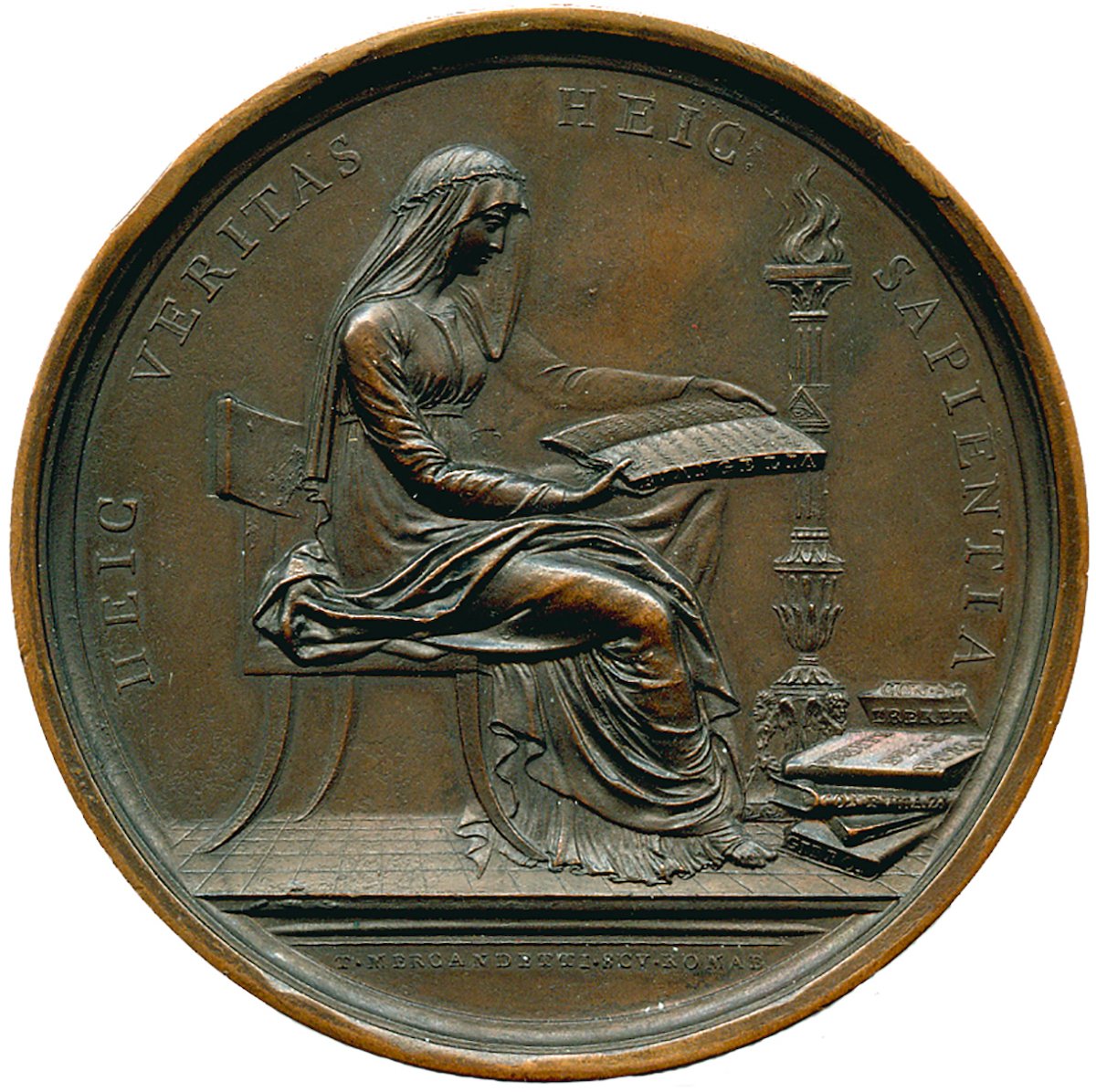 Figura allegorica della filosofia velata ritratta mentre legge seduta alla luce di un alto candeliere; ai suoi piedi vari volumi. All’esergo: T·MERCANDETTI·SCV·ROMAE (TOMASO MERCANDETTI HA SCOLPITO A ROMA)