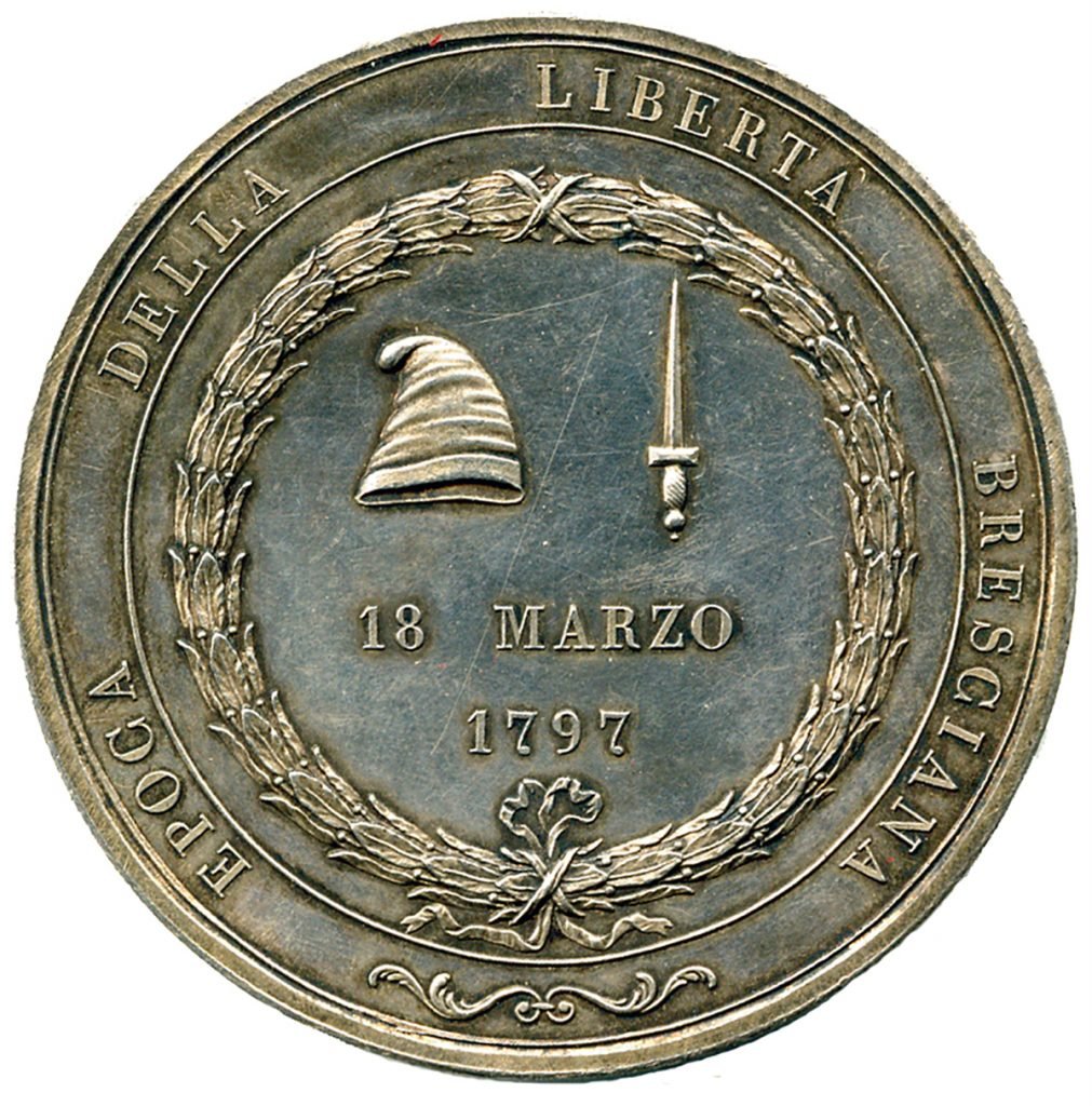 Medaglia commemorativa della presa del Palazzo del Broletto di Brescia, all’alba dell’istituzione della Repubblica Bresciana. Peso: 59 gr.