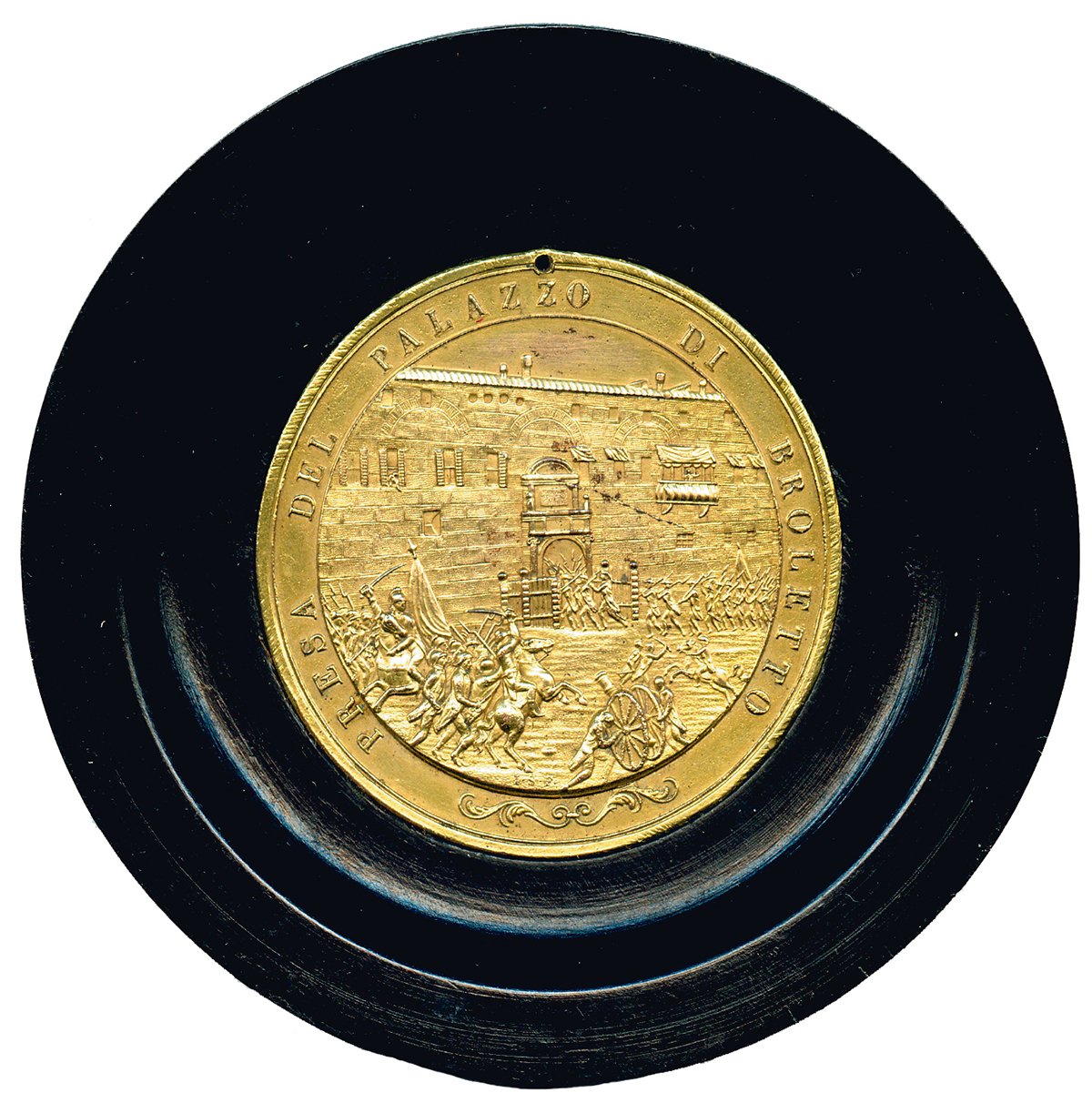 Medaglia commemorativa della presa del Palazzo del Broletto di Brescia, all’alba dell’istituzione della Repubblica Bresciana. La medaglia è inserita in una cornice di legno scuro, probabilmente d’epoca, e presenta un foro a ore dodici.