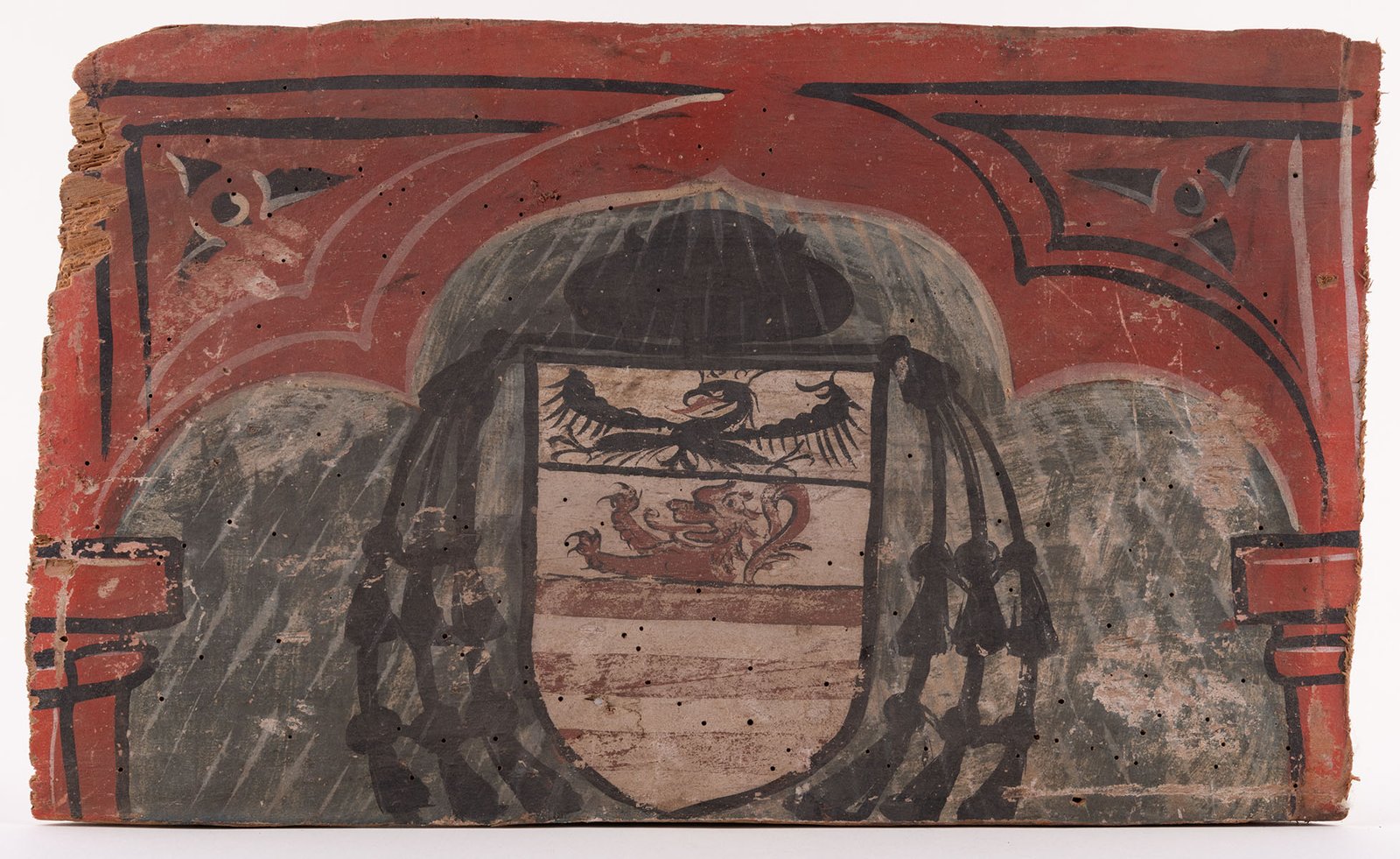 E’ raffigurato uno stemma di ecclesiastico, tripartito e incorniciato in profili trilobati formati